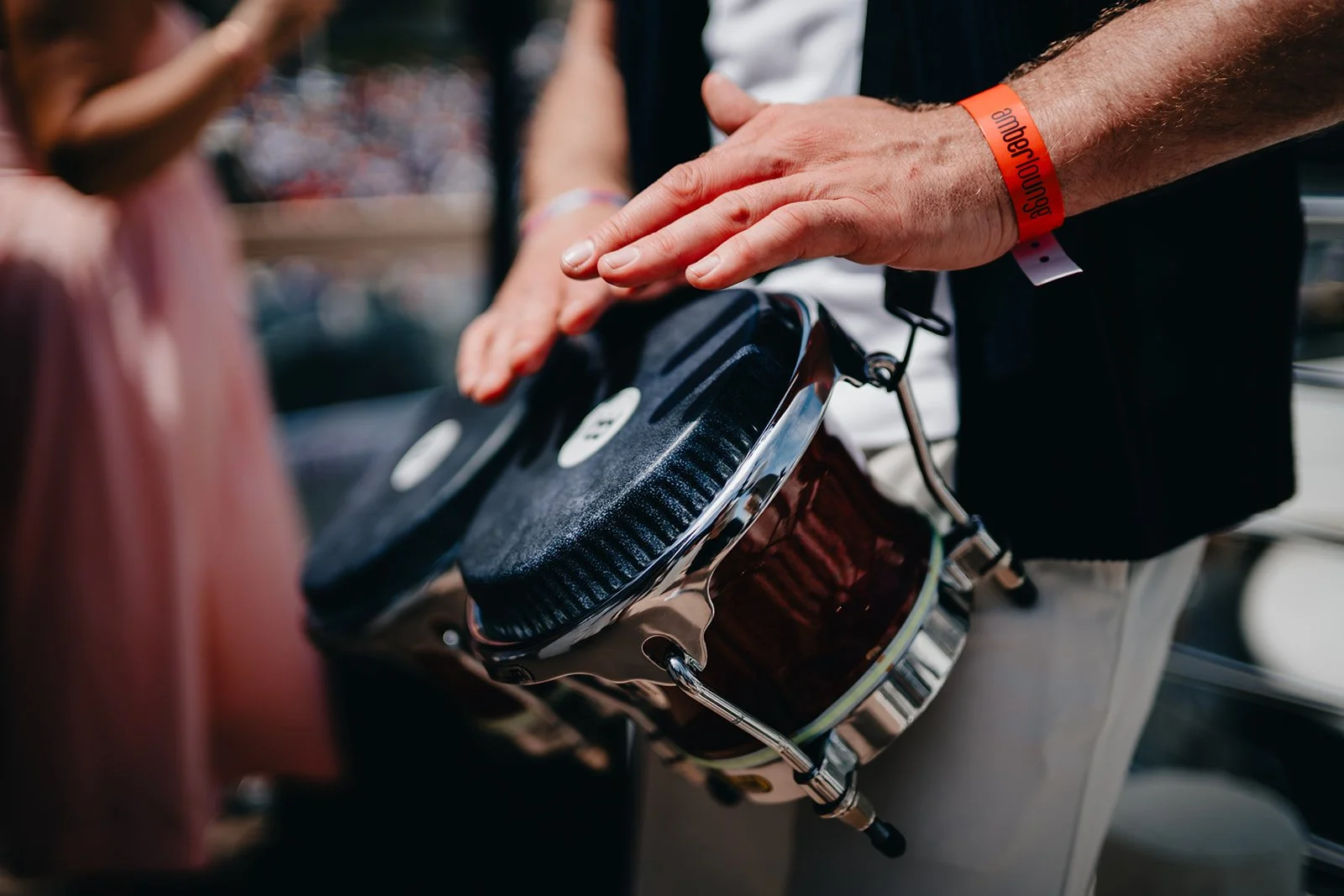 • A person is playing Bongos at an outdoor event, with their hand raised above the drum. The person is wearing a black shirt with a white undershirt and has a red wristband on their wrist.