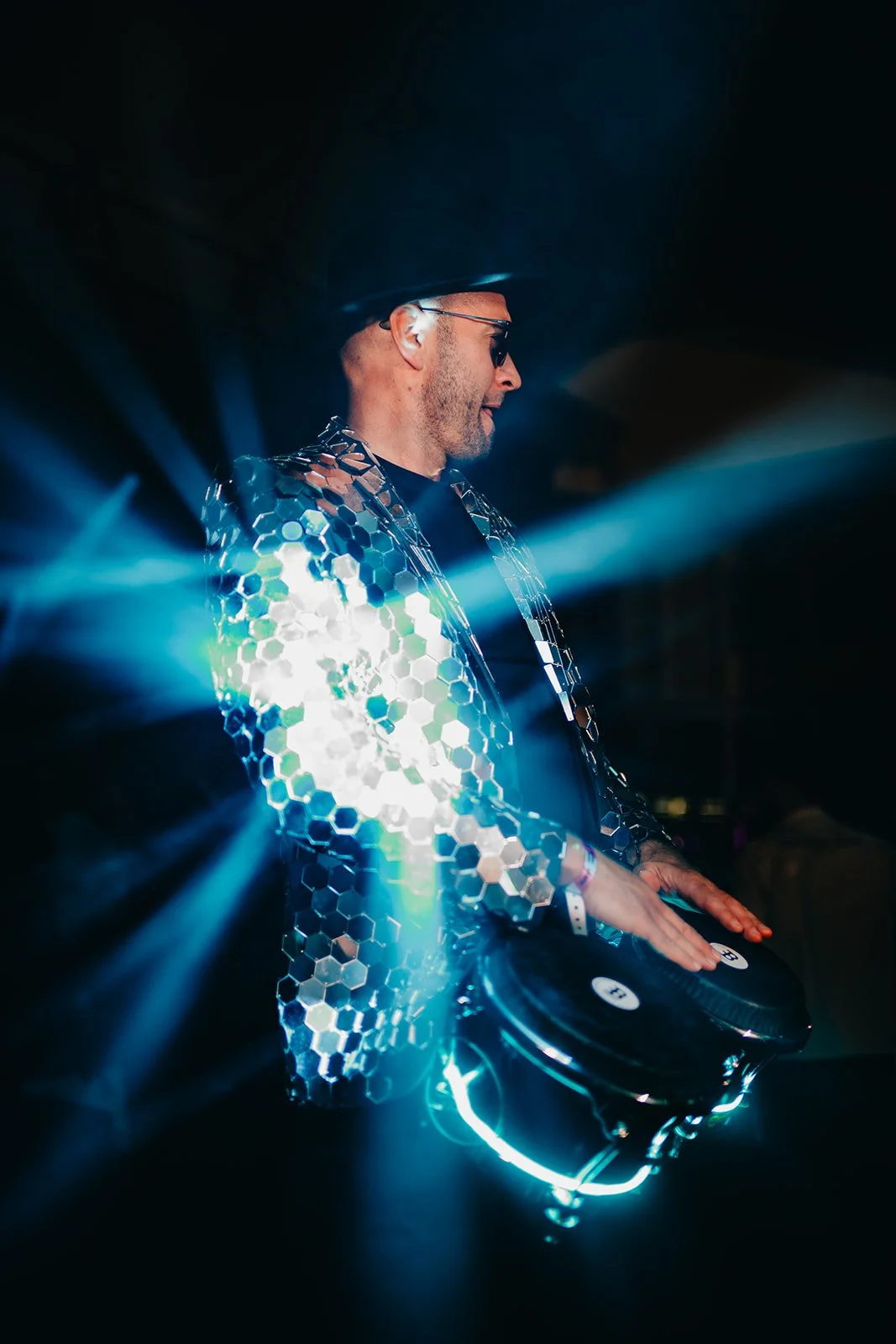 • A man wearing a black hat, sunglasses, and a black jacket, playing live LED bongos with a DJ at a lively outdoor party at night.